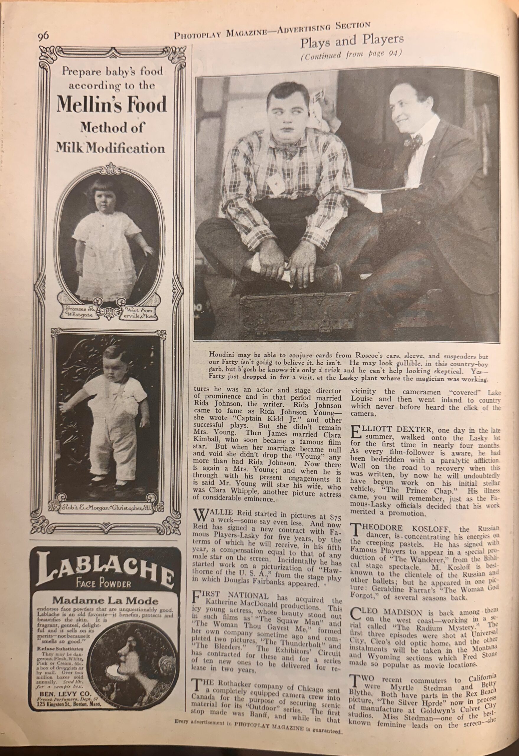 Per John Cox comment: The caption has it backwards, that isn’t Rosco dropping into see Houdini at the Lasky Studio. That’s Houdini dropping into the Comique Studio to see Rosco during the production of Back Stage, July 1919.