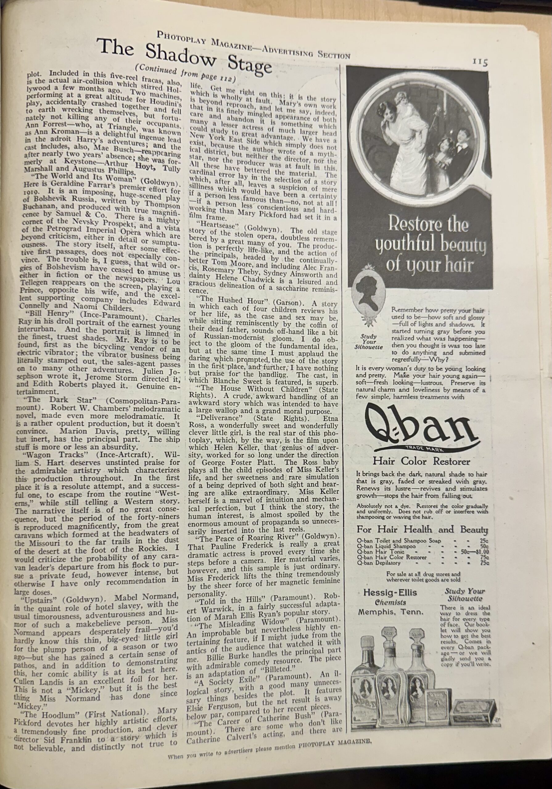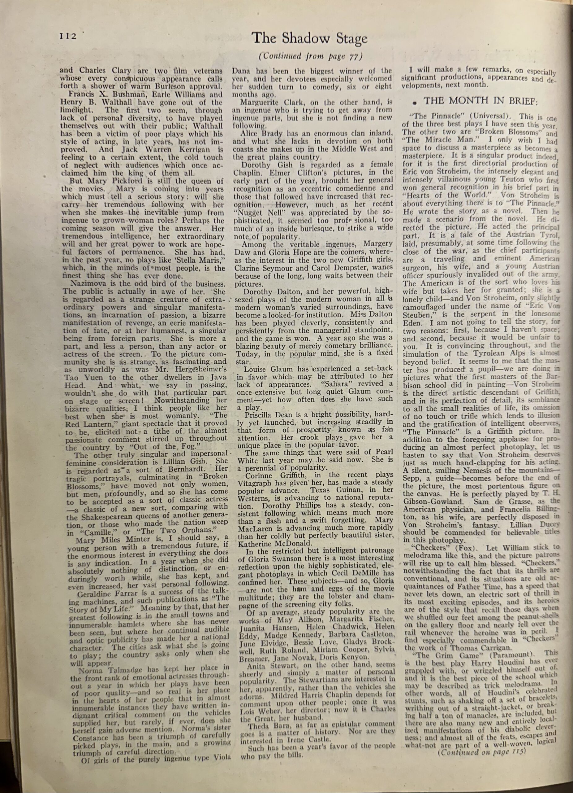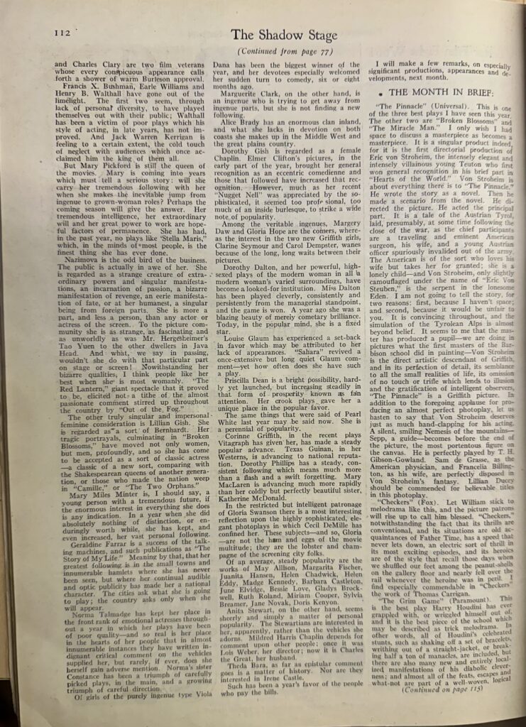 plot. Included in this five-reel fracas, also, is the actual air-collision which stirred Hollywood a few months ago. Two machines performing at a great altitude for Houdini’s play, accidentally crashed together and fell to earth wrecking themselves, but fortunately not killing any of their occupants. Ann Forrest–who, at Triangle, was known as Ann Kroman–is a delightful ingenue lead in the adroit Harry’s adventures; and the cast includes, also Mae Busch–reappearing after nearly two years’ absence; she was formerly at Keystone–Arthur Hoyt, Tully Marshall and Augustus Phillips.