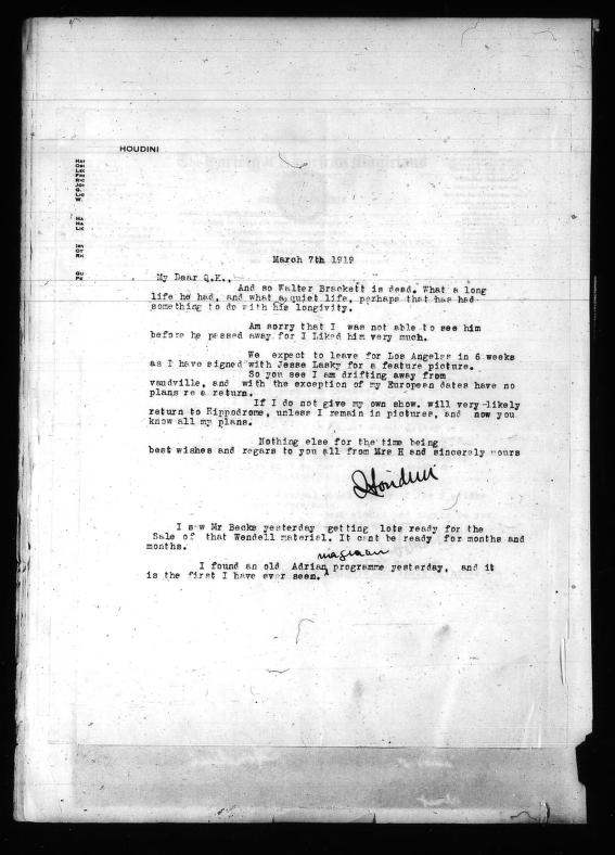 No sooner had Houdini finished “The Grim Game” for Famous Players-Lasky [FPL] than Jesse, manager of the last half of the concern, secured the signature to a new contract. By the terms of this agreement Houdini will remain with the Zukor organization for an indefinite time.